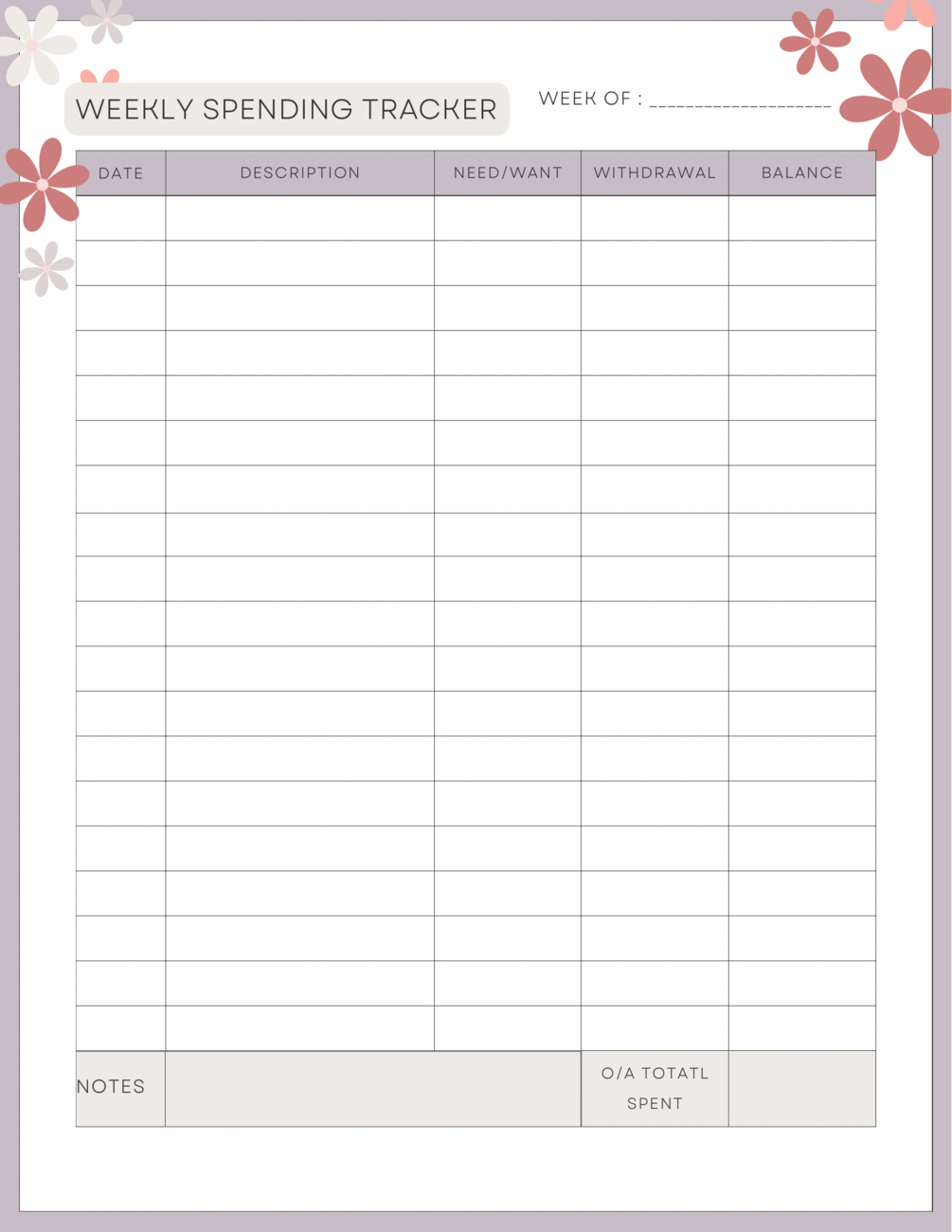 This weekly spending tracker helps you stay on top of your expenses while highlighting your ‘wants’ vs. ‘needs.’ By categorizing your purchases, you’ll get a clear picture of where you can cut back and where your spending is essential, helping you make smarter, more mindful financial choices every week.
